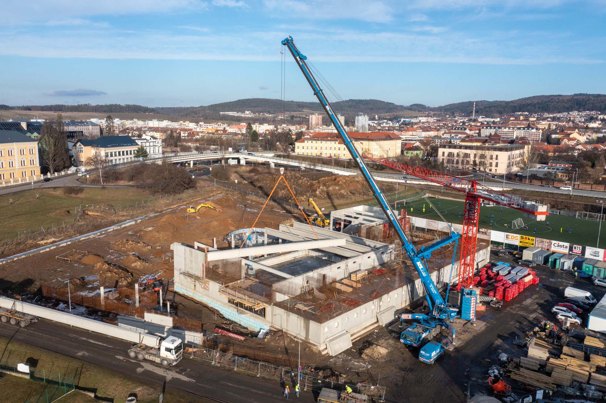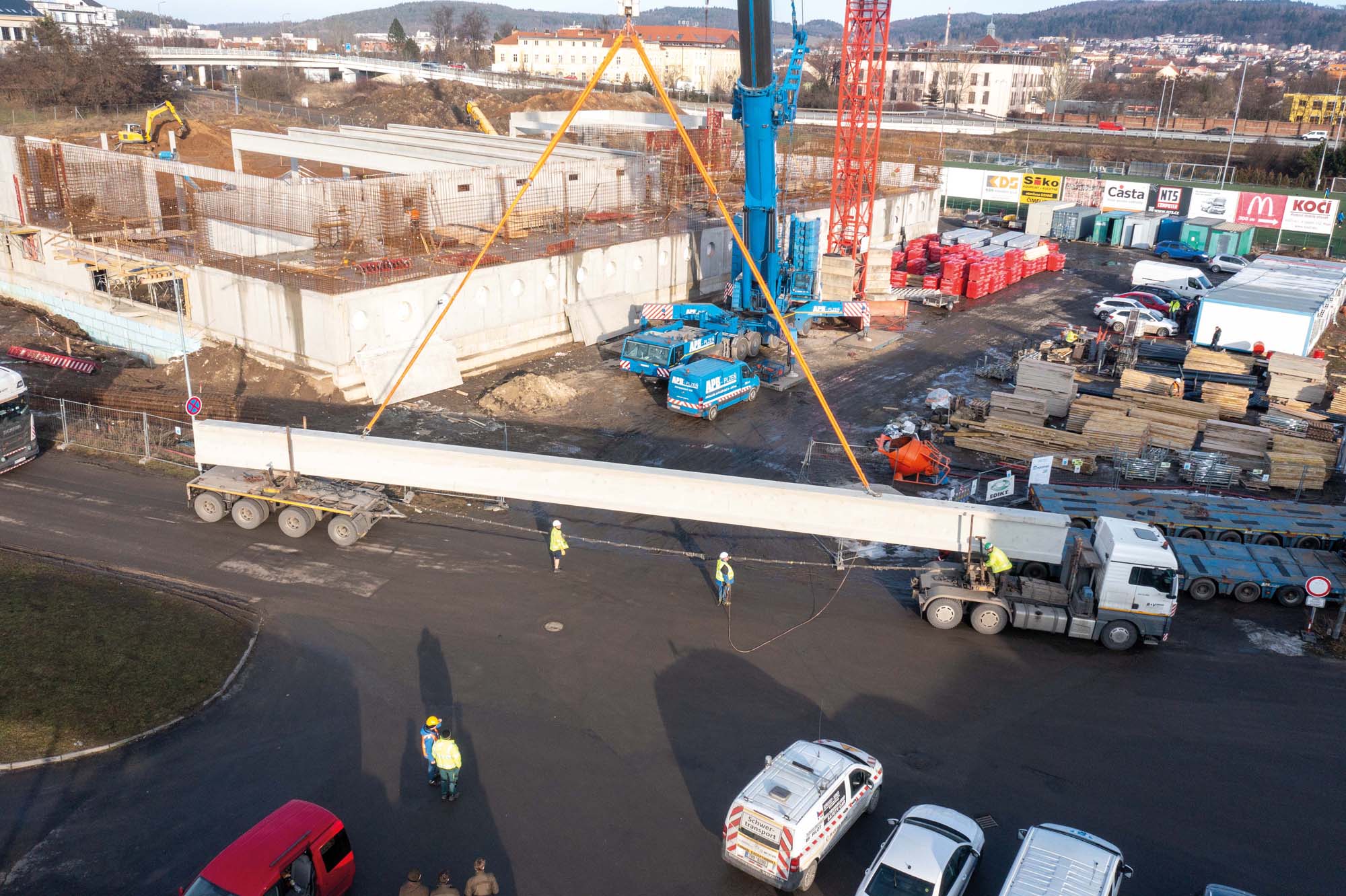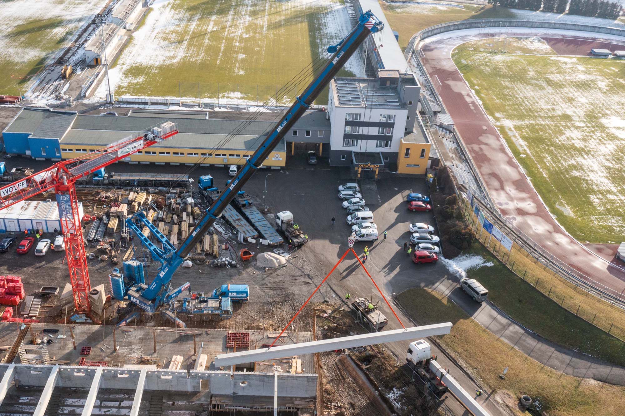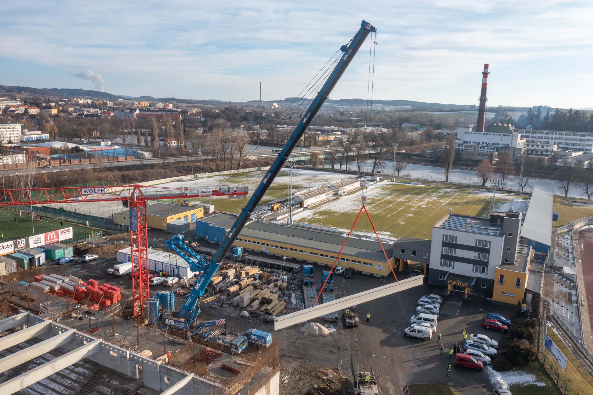 Demag AC 500 v akci: 6 nosníků | 26 tun | 30 m. Další krok stavby hotov.