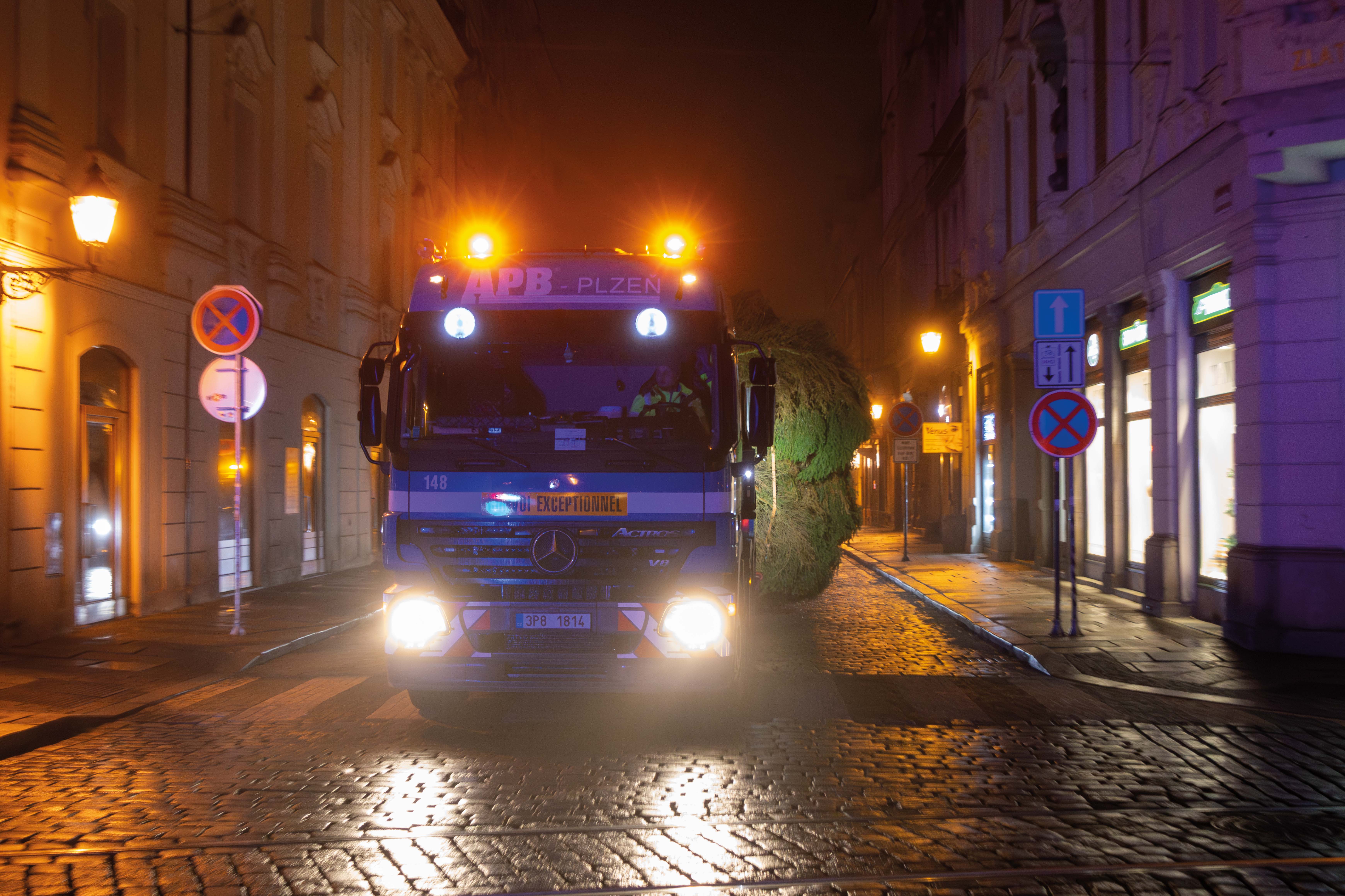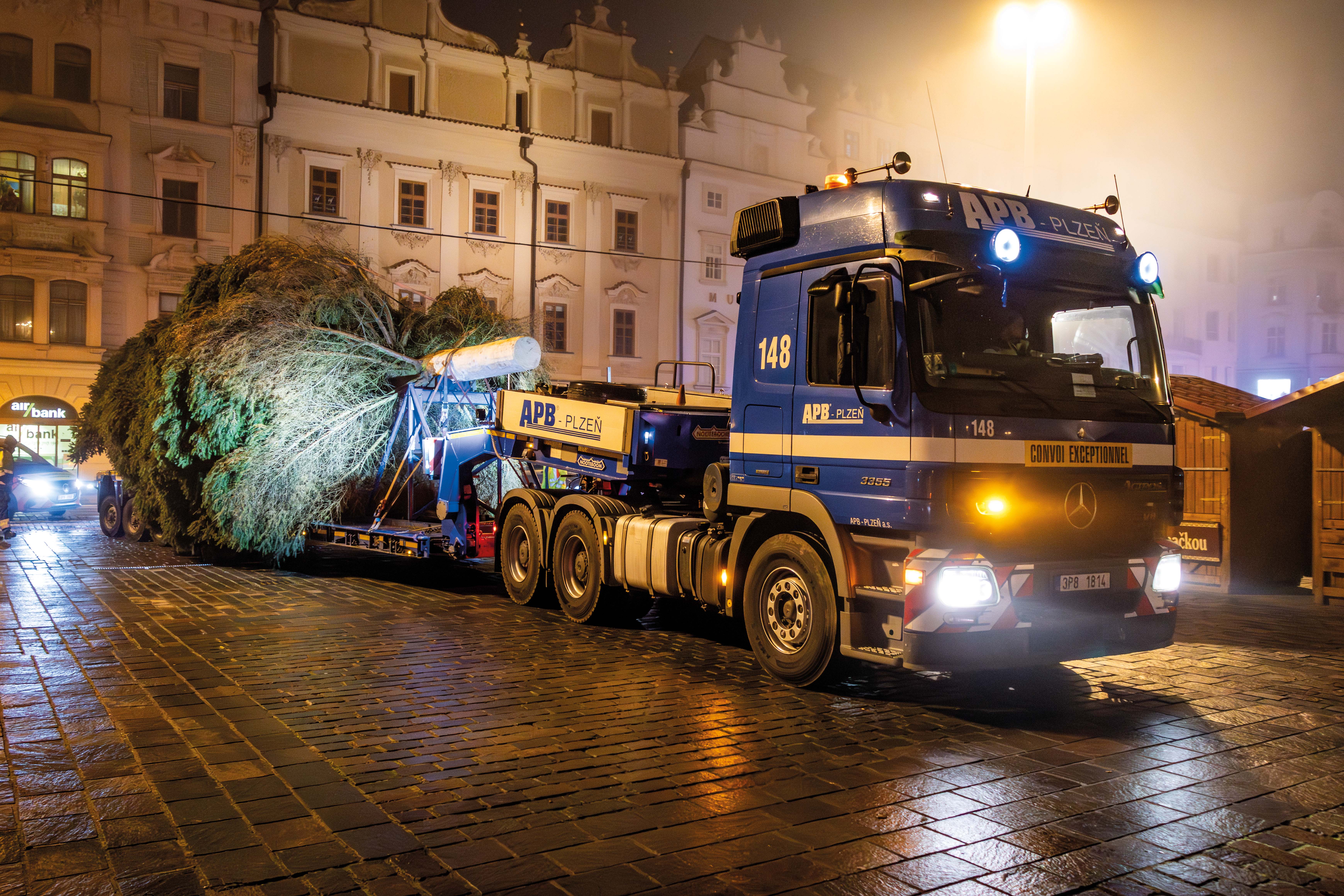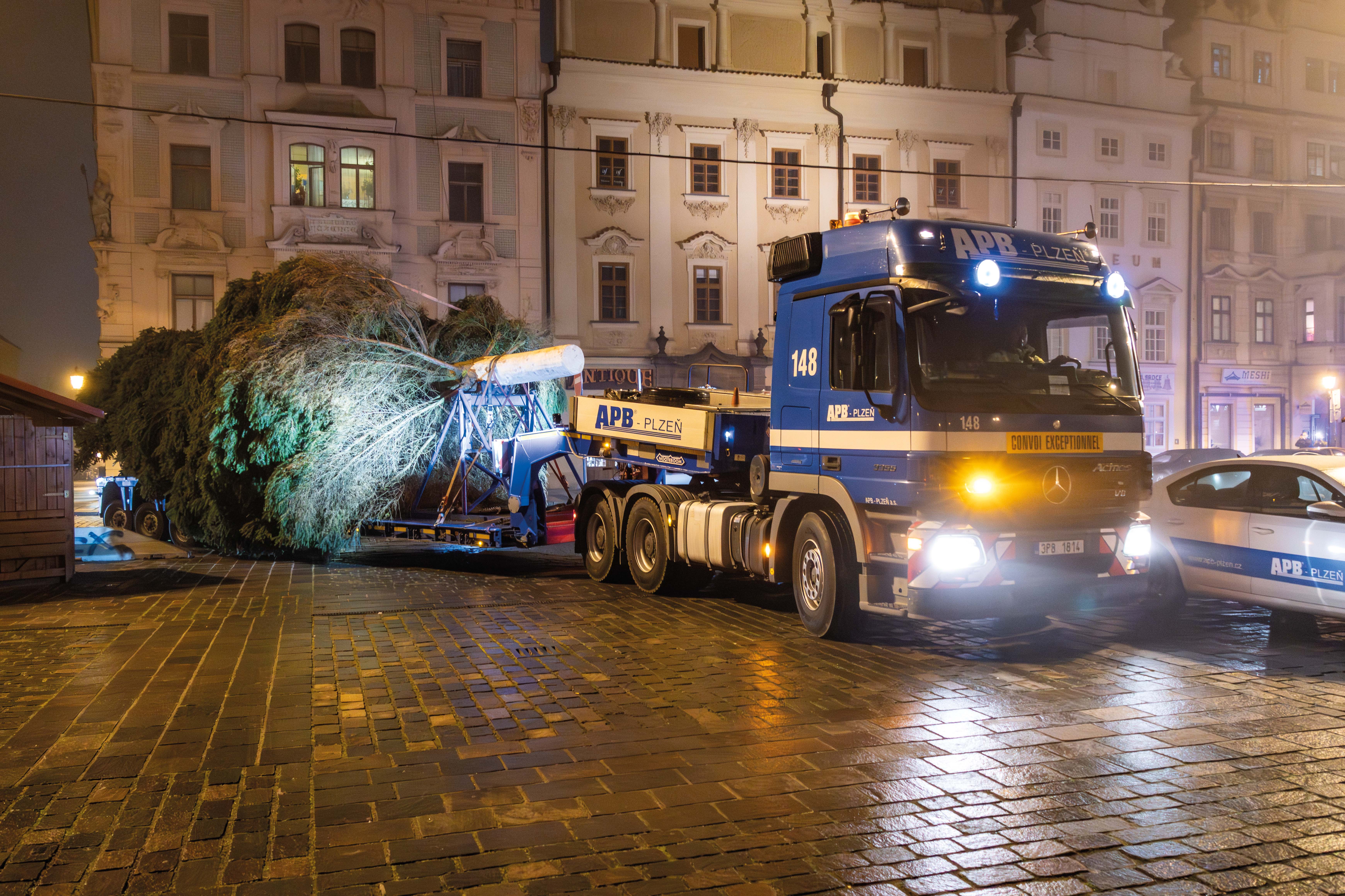 Cesta letošního vánočního stromu do Plzně začala ve Stodě, kde jsme pečlivě připravili nádherný smrk ztepilý pro svou slavnostní cestu. Pomocí výkonného autojeřábu LIEBHERR LTM 1070 jsme strom bezpečně naložili na podvalník a vydali se s ním směrem na plzeňské náměstí Republiky.