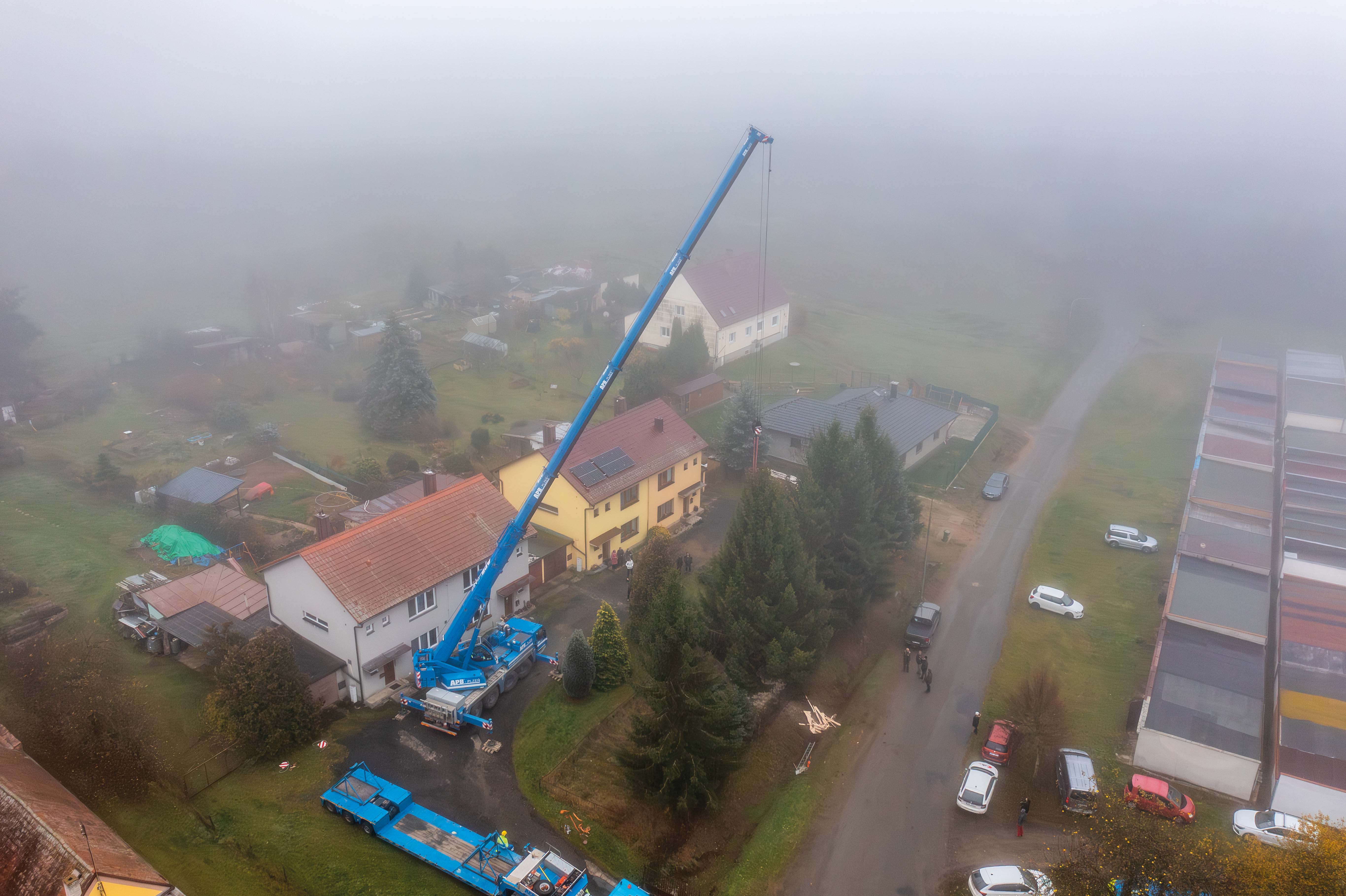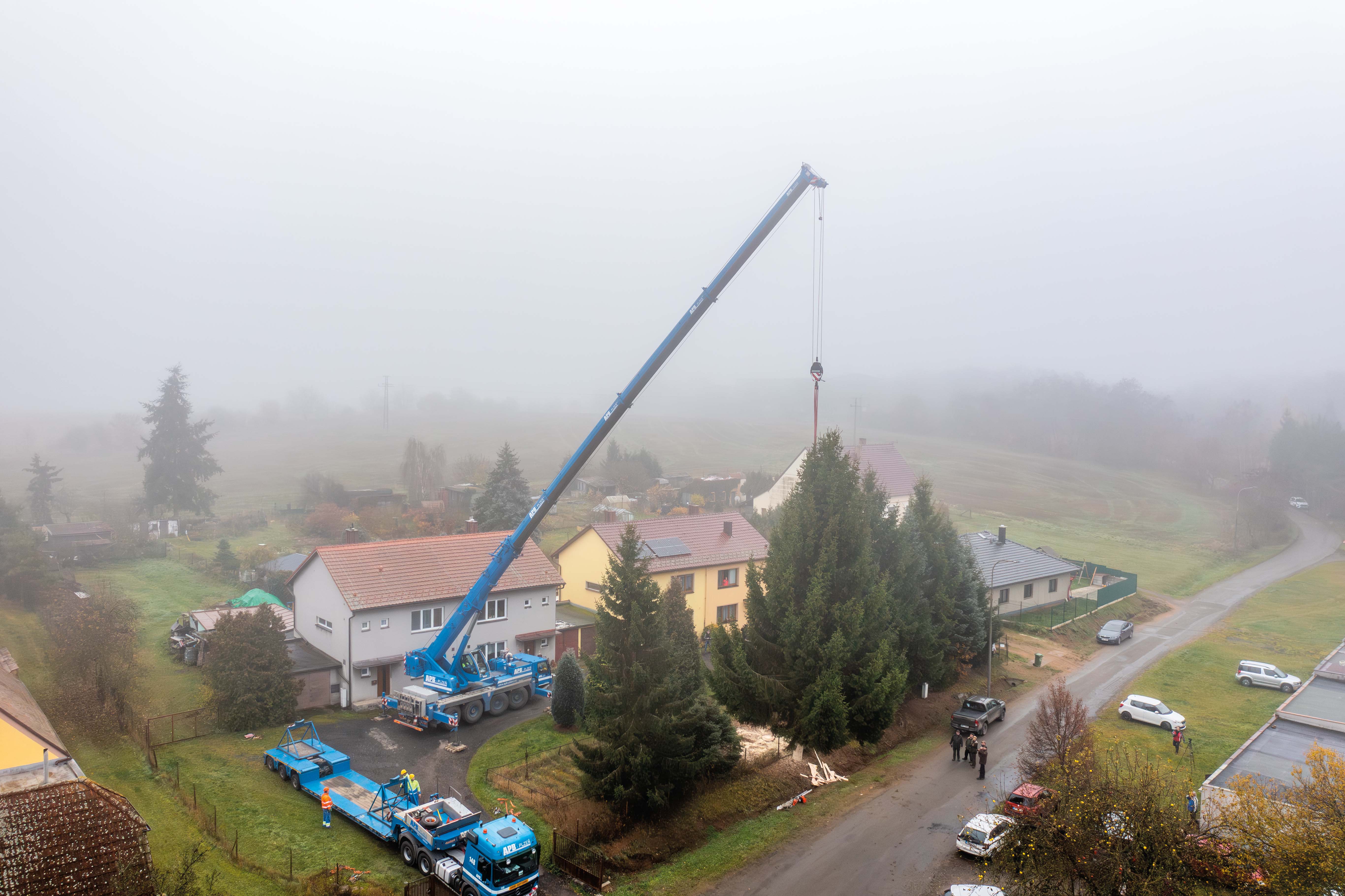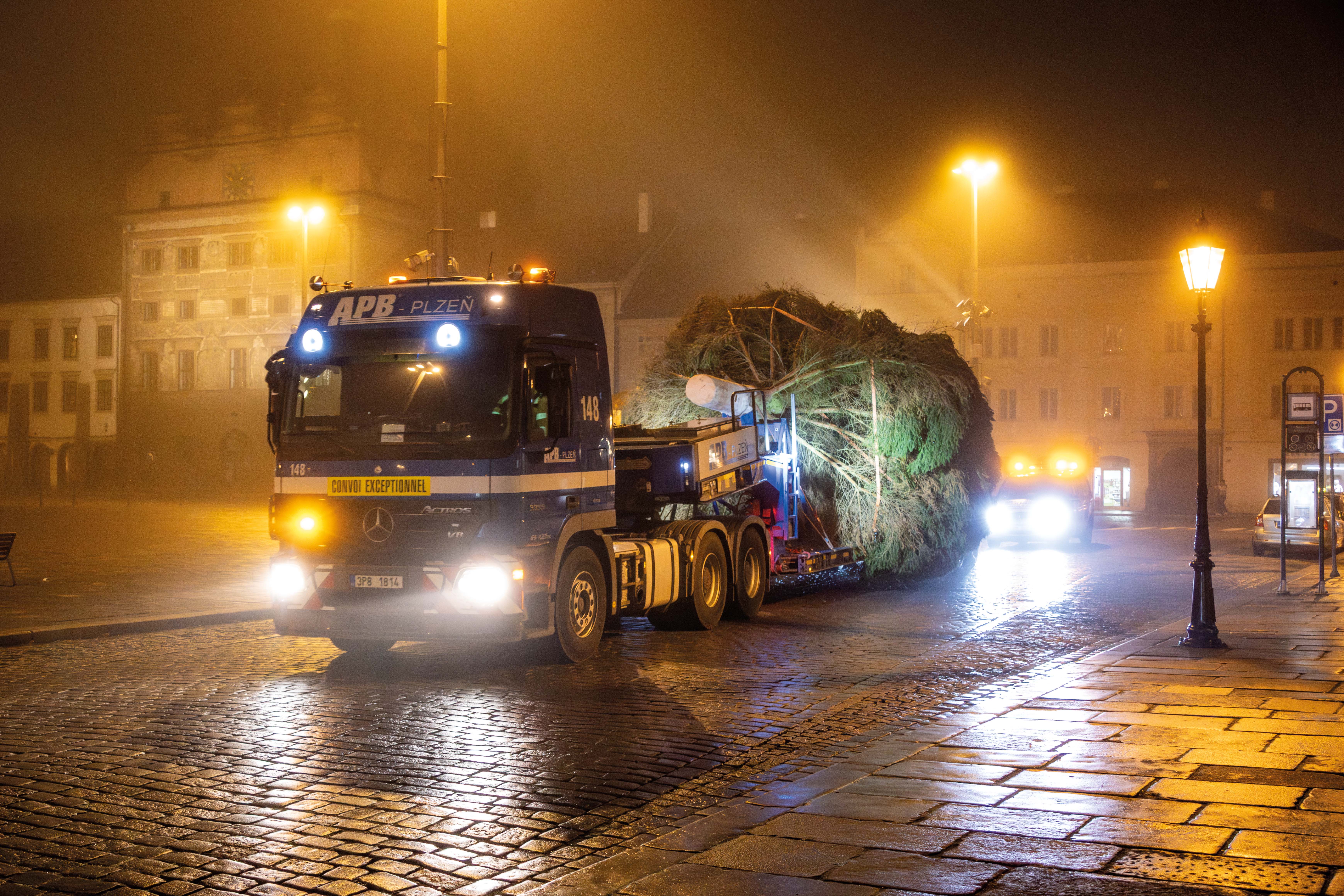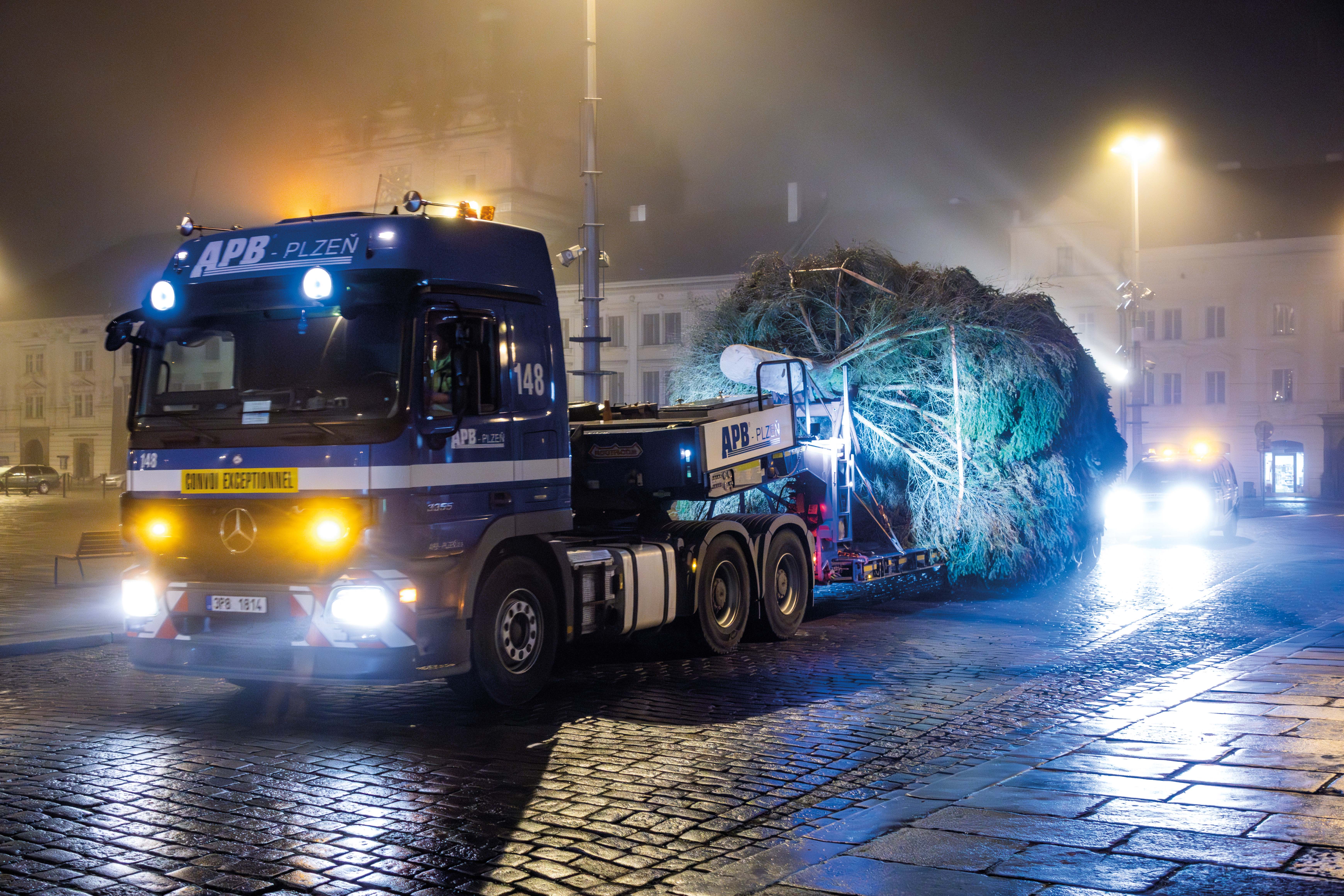 Cesta letošního vánočního stromu do Plzně začala ve Stodě, kde jsme pečlivě připravili nádherný smrk ztepilý pro svou slavnostní cestu. Pomocí výkonného autojeřábu LIEBHERR LTM 1070 jsme strom bezpečně naložili na podvalník a vydali se s ním směrem na plzeňské náměstí Republiky.