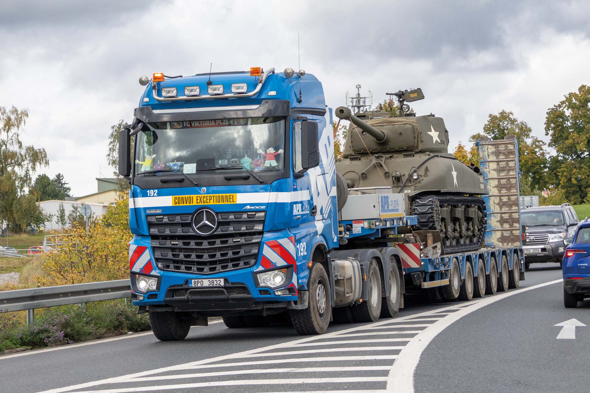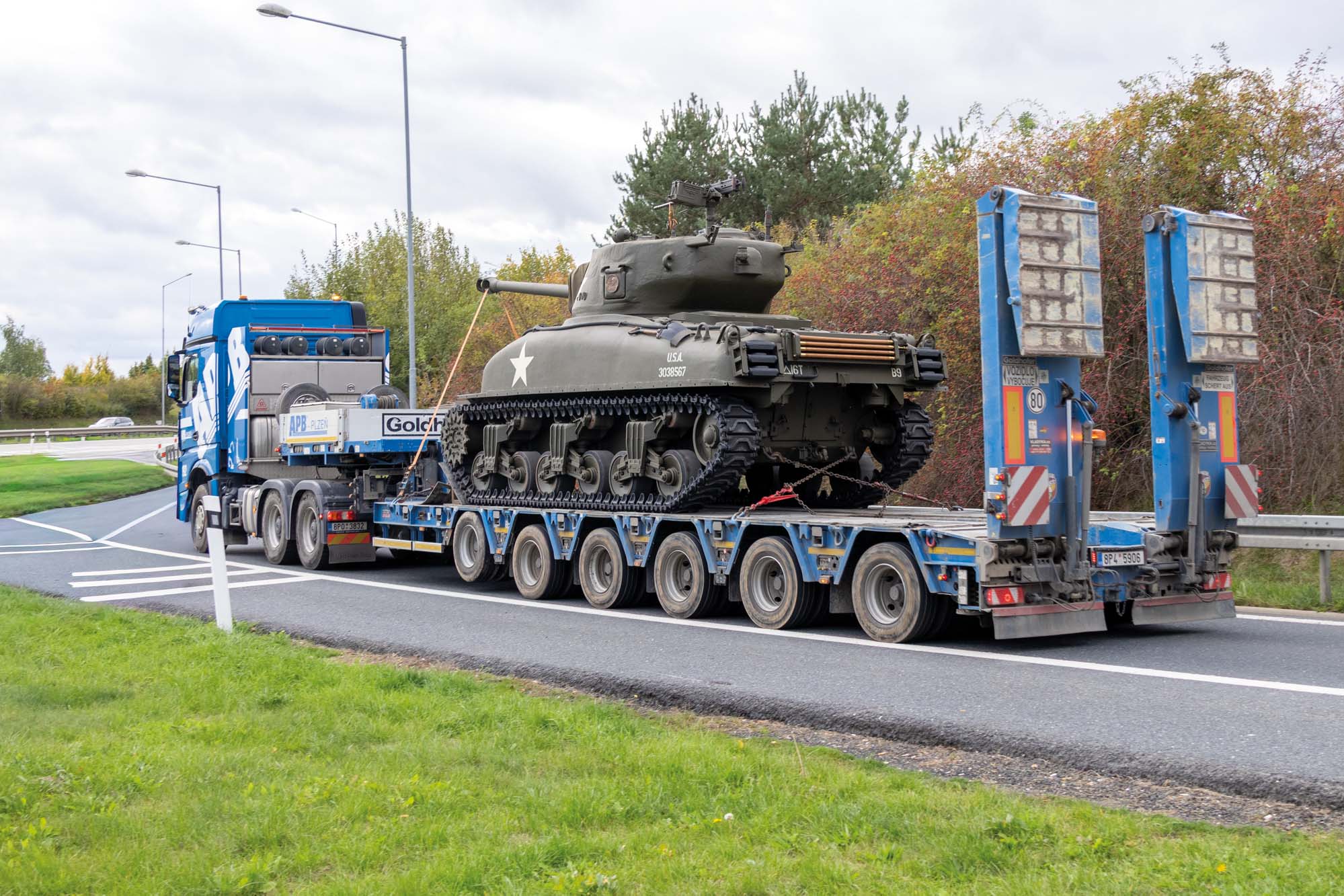 Zajistili jsme transport amerického tanku Sherman M4 do Plzně na Klatovskou třídu. Zde pomocí jeřábu AC 500 jsme přesunuli legendární tank Sherman M4 přes střechu domu na Klatovské 19.